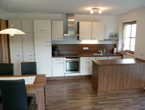 Die Küchenzeile beinhaltet 4 Kochfelder mit Abzugshaube, einen Kühlschrank mit Tiefkühlfach, ein Backrohr und eine Spüle mit Geschirrspülmaschine und ist mit Geschirr/Besteck, Kaffeemaschine und Wasserkocher ausgestattet.